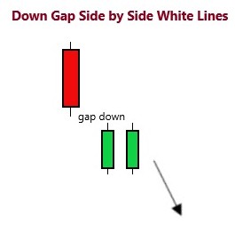 The Down Gap Side-by-Side White Lines is a bearish continuation pattern that appears during a downtrend. Despite showing two consecutive bullish (white/green) candles, the pattern actually strengthens the bearish trend, not reverses it.