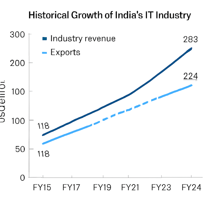 India’s IT & BPM sector is a cornerstone of the economy, contributing USD 283 billion in FY24 (~7.3% of GDP) and projected to reach USD 350 billion by FY26 (~10% of GDP). The sector remains bullish, supported by digital transformation, AI adoption, and global capability centres (GCCs).