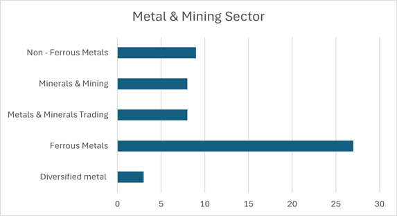India’s Metals & Mining sector consists of 55 companies across five categories: 3 in diversified metals, 27 in ferrous metals, 8 in metals and minerals trading, 8 in minerals and mining, and 9 in non‑ferrous metals. Ferrous metals dominate the sector, while non‑ferrous and mining firms supply critical inputs for infrastructure and renewable energy